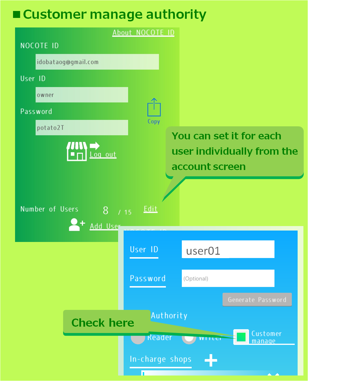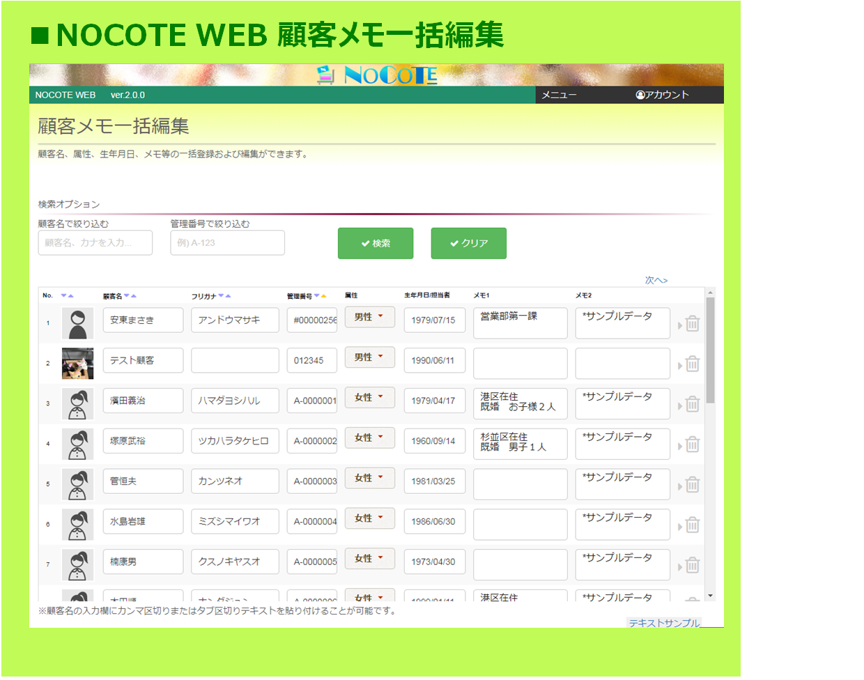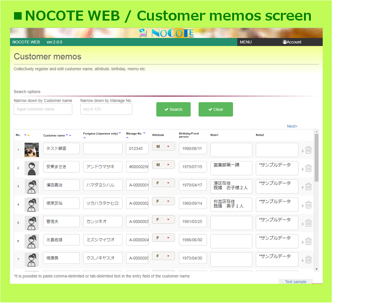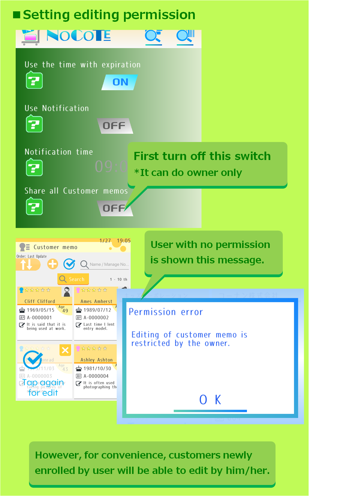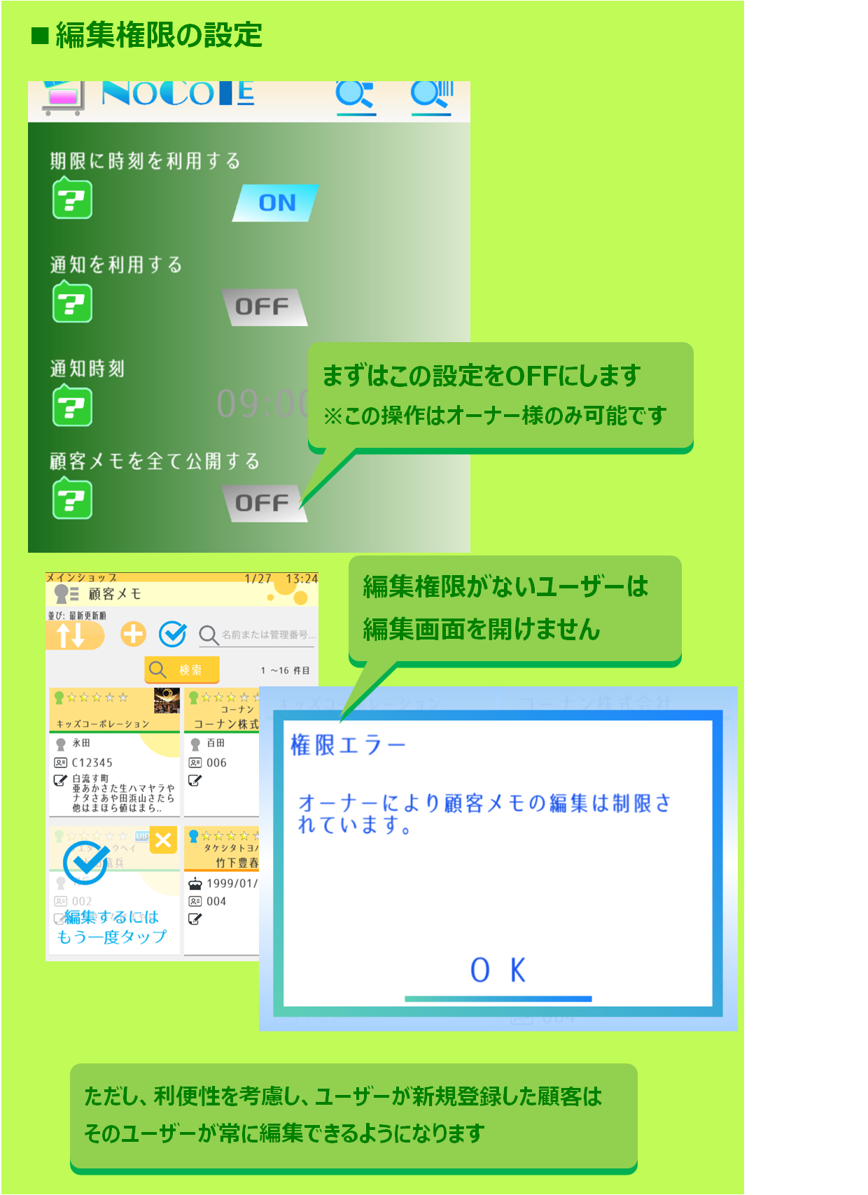 By using the data sharing function, customer notes can also be shared with staff members and members of the store. However, there may be some uneasiness about disclosing all contents related to personal information. On the other hand, users are unable to identify customers unless they know the name etc. Therefore, NOCOTE has a function to limit editing authority. Please use Note2 for important privacy information.