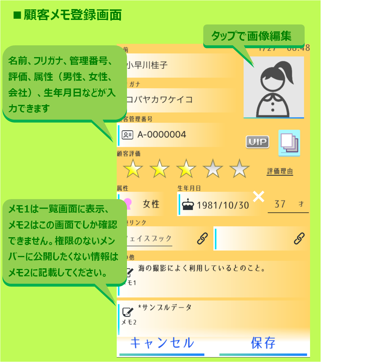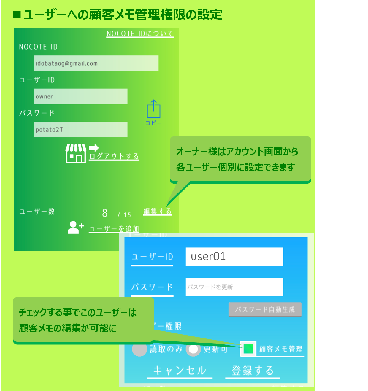 データ共有機能を利用する事で顧客メモもお店のスタッフやメンバーと共有する事ができます。ただし、個人情報に関わる内容などすべて開示するのは不安がある方もいるでしょう。一方で名前等が分からないとユーザーは顧客を識別することができません。そこで、NOCOTEには編集権限を限定する機能があります。プライバシーとして重要な情報はメモ2に記載し、編集権限のある人にしか見えなくする事ができます。